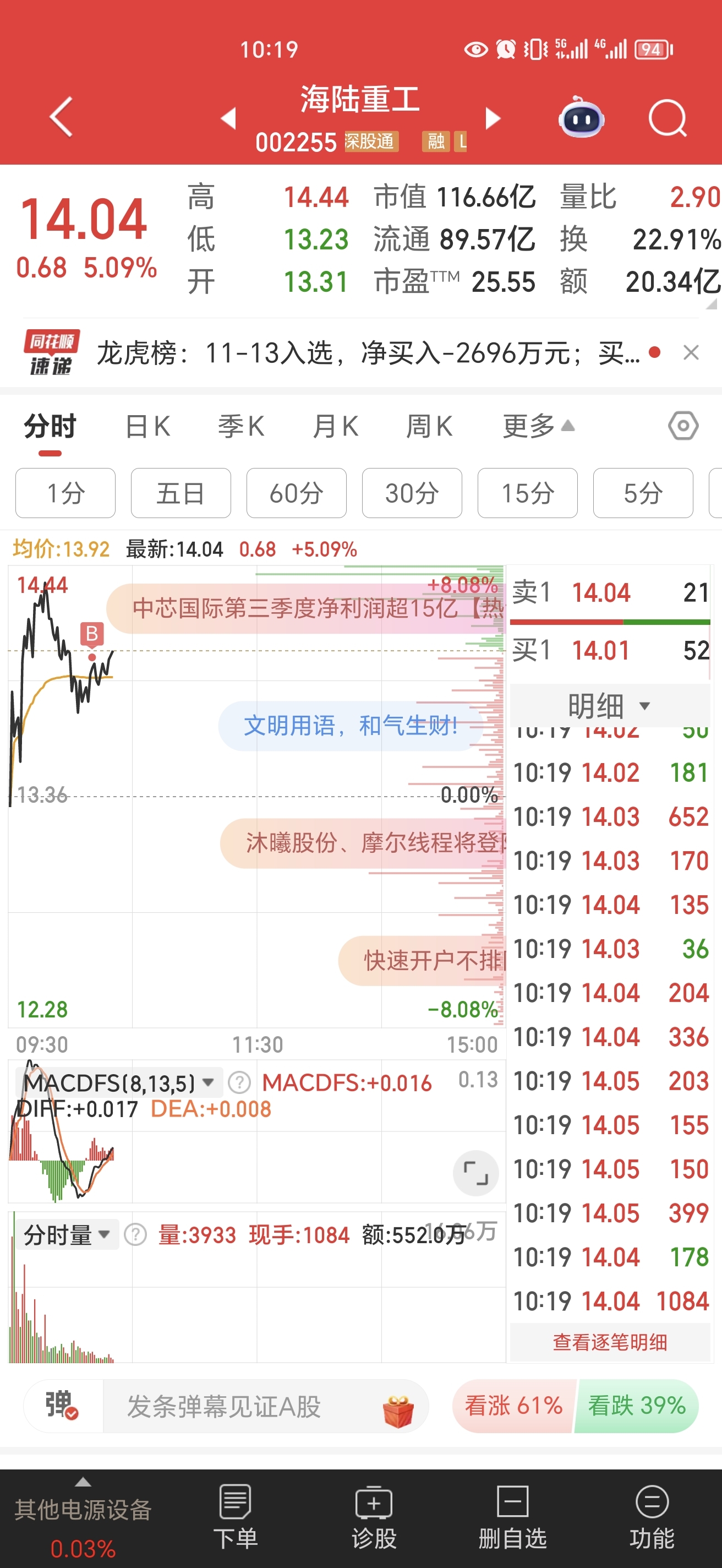 $海陆重工(SZ002255)$ 追了一成仓