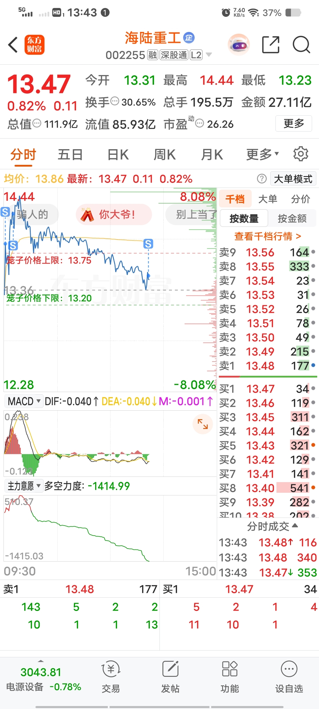 $海陆重工(SZ002255)$ 没戏了,老奶奶下楼梯,尾盘如果没有资金进,周一估计低开出不去了,不赌了,全部清仓,大盘太差,今天尾盘很难有资金进来偷鸡