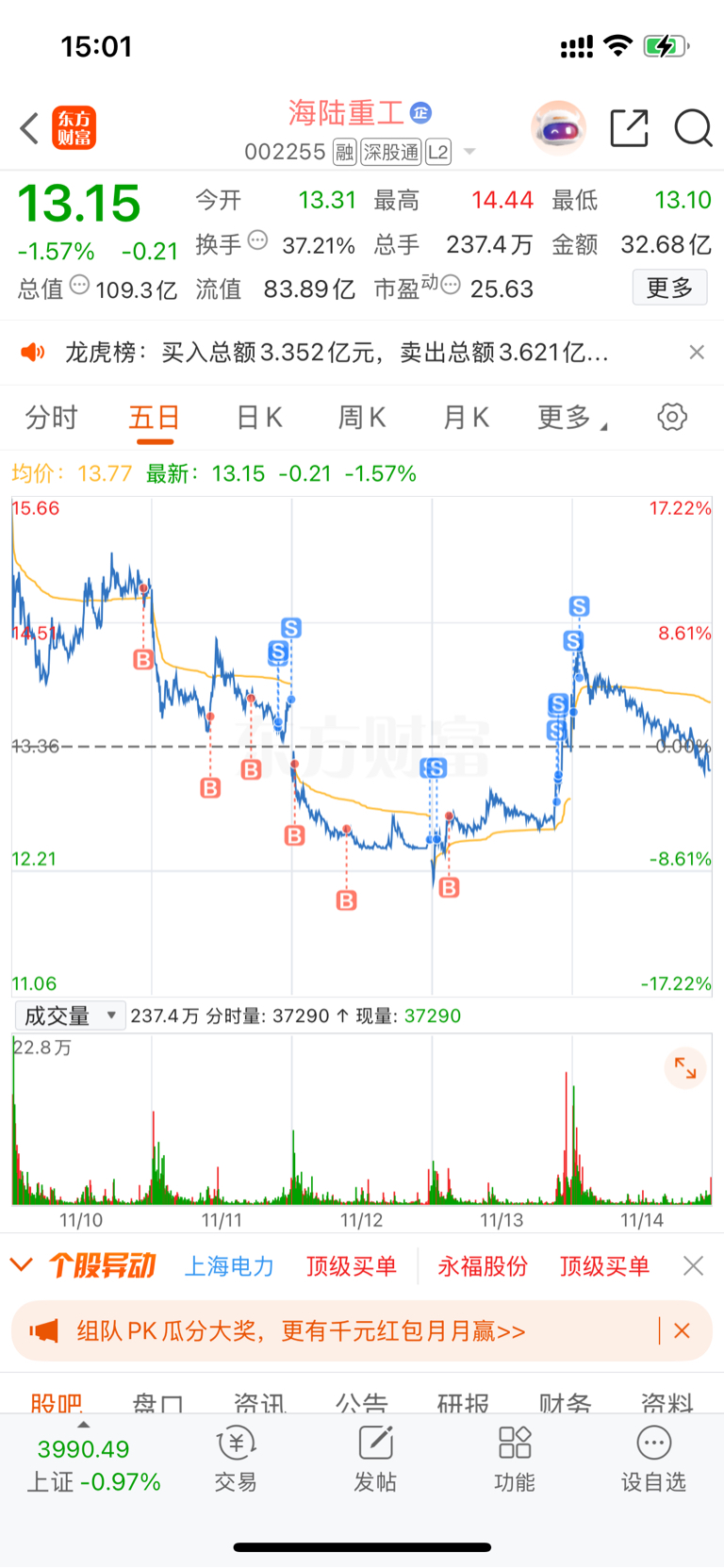 $海陆重工(SZ002255)$ 拿了一周,最终减亏至8000暂时离场,主要是没把T做好,否则应该能回本的。下周择机再接回来吧,跟丫死磕到底。