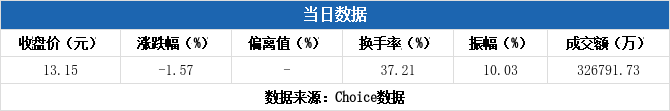 深交所2025年11月14日交易公开信息显示,海陆重工因属于当日换手率达到20%的证券而登上龙虎榜。海陆重工当日报收13.15元,涨跌幅为-1.57%,换手率37.21%,振幅10.03%,成交额32.68亿元。