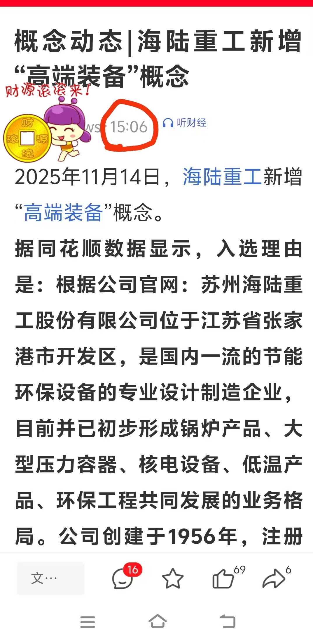 $海陆重工(SZ002255)$ 海陆重工盘后新增高端装备概念
