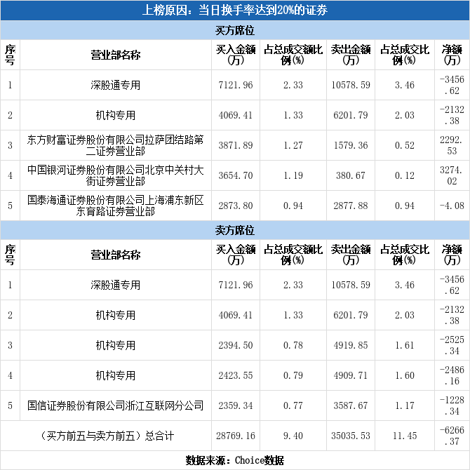 今日龙虎榜单上出现了深股通的身影,占据了买一、卖一的位置,净卖出3456.62万元,占当日成交总额的1.13%。除此之外深股通还参与到了粤桂股份、盈新发展、天华新能等18只个股中,其中12家呈现深股通净买入,获净买入最多的是盈新发展,净买额为9397.92万元;6家呈现深股通净卖出,遭净卖出最高的为粤桂股份,净卖额为9481.17万元。