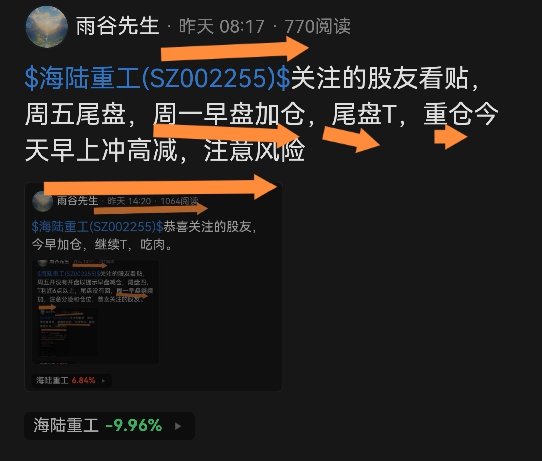 $海陆重工(SZ002255)$ 关注的股友看贴,注意时间,实战贴。昨天早上没有开盘提示减仓,没有加,外面下雨,尾盘或5个点左右接回。