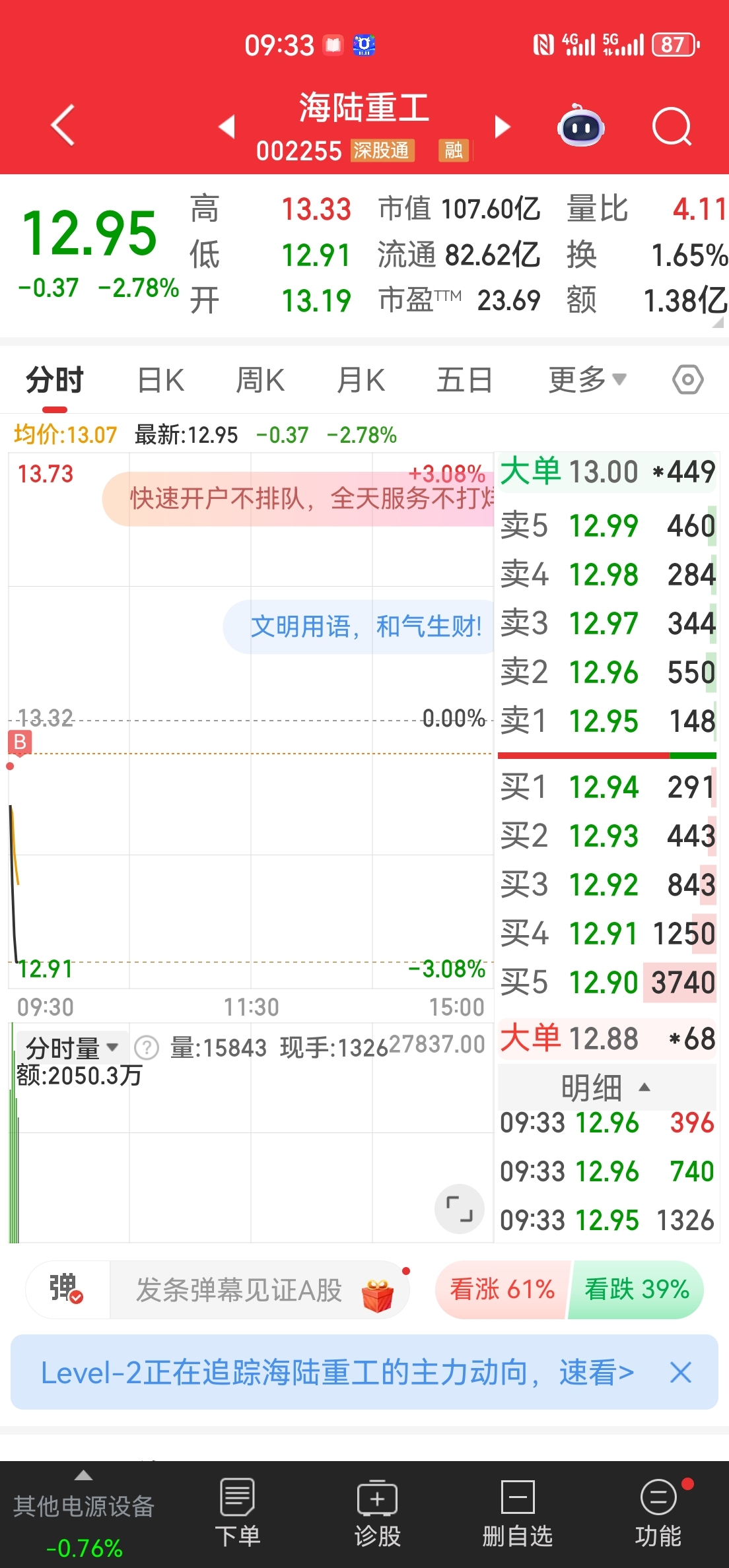 $海陆重工(SZ002255)$ 一万到一百万第27天,天际开盘走了,-0.5买了海陆重工