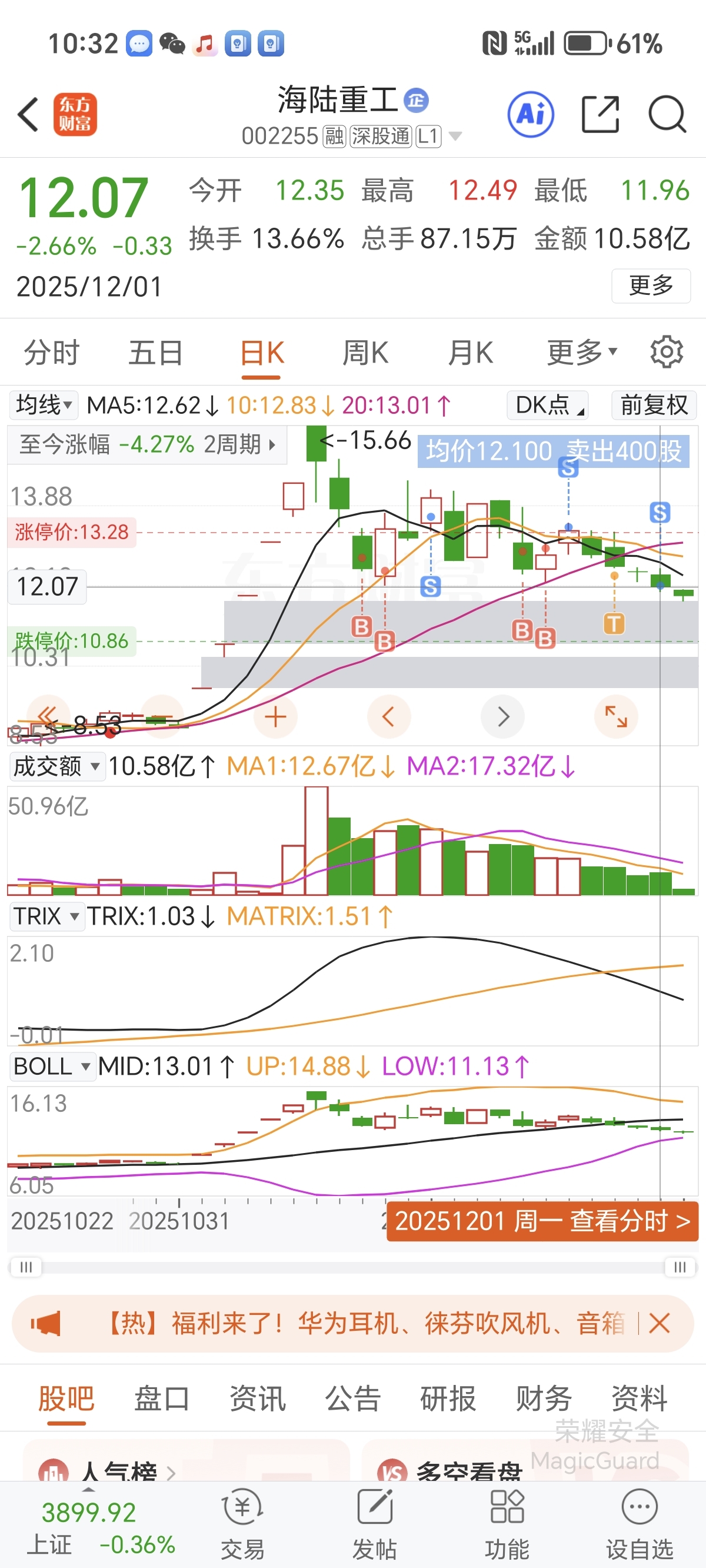 $海陆重工(SZ002255)$ 从十几个点到赚几个点,回吐难受