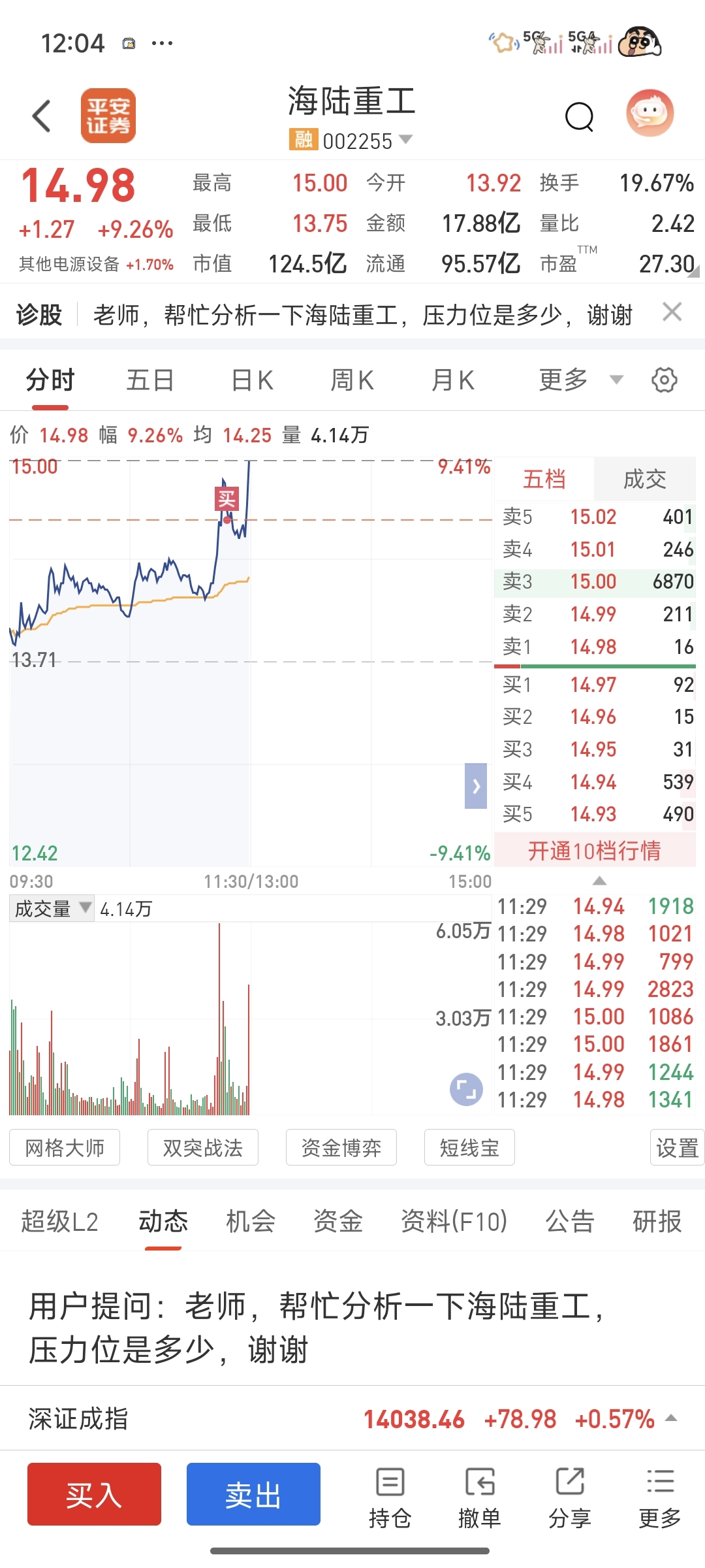 $海陆重工(SZ002255)$  上午进了不知道下午会不会跳水