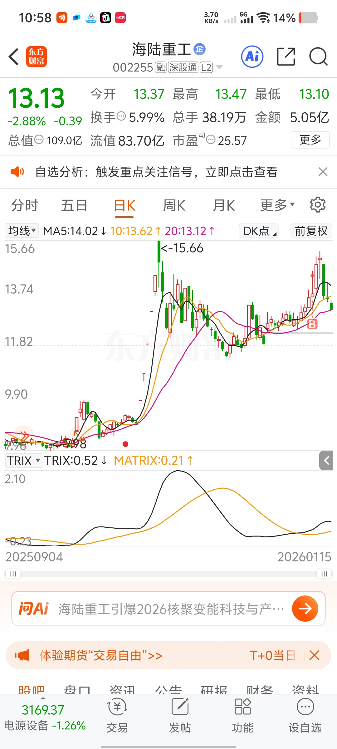 $海陆重工(SZ002255)$ 被套在山顶上了