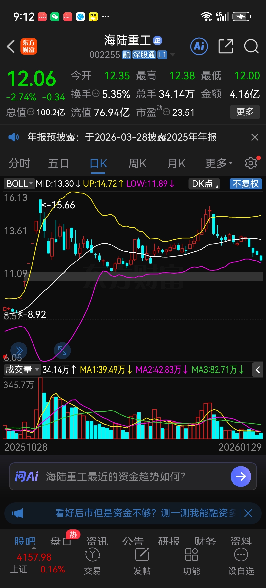 $海陆重工(SZ002255)$ 难道你们不看布林线吗?已经到了下轨,一般至少会做个三头。我今天还加仓,怕啥呀?干就完了