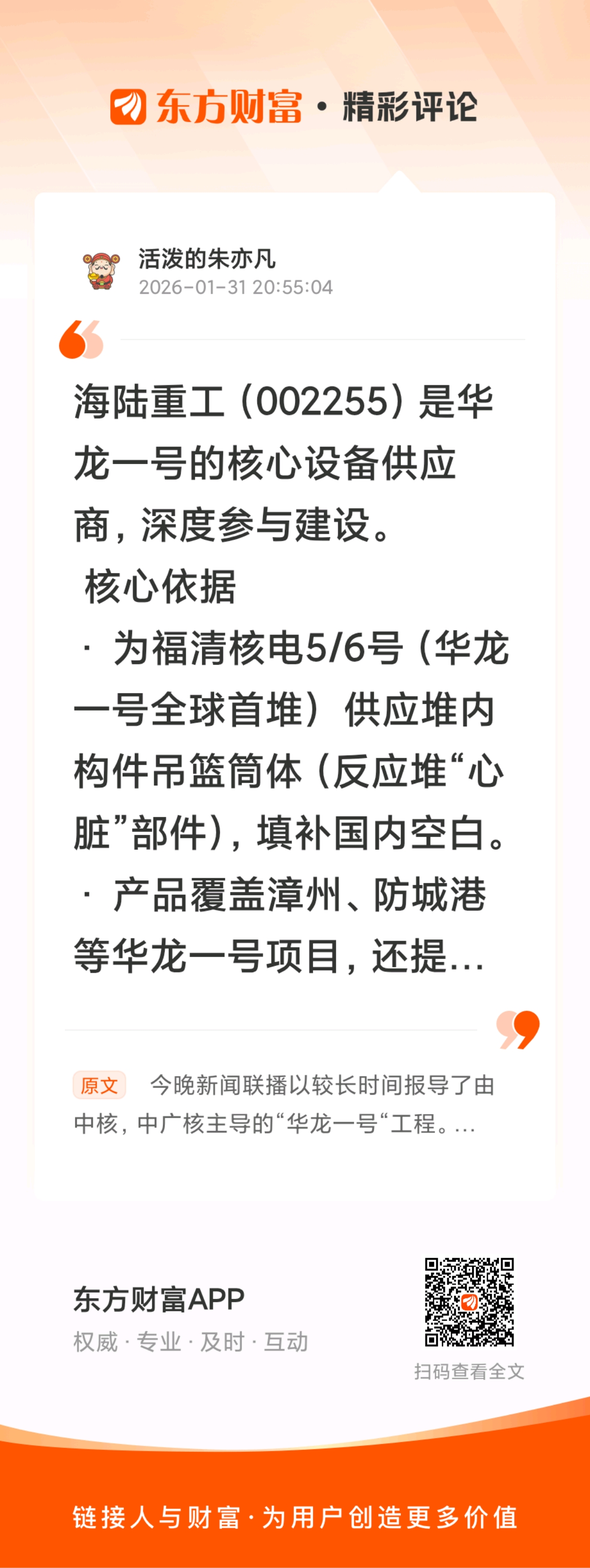 //@活泼的朱亦凡 :海陆重工(002255)是华龙一号的核心设备供应商,深度参与建设。 核心依据• 为福清核电5/6号(华龙一号全球首堆) 供应堆内构件吊篮筒体(反应堆“心脏”部件),填补国内空白。• 产品覆盖漳州、防城港等华龙一号项目,还提供安注箱、PRS应急补水箱等核安全设备。• 公司具备核安全1级设备制造资质,2026年1月互动易确认其华龙一号供应商身份。