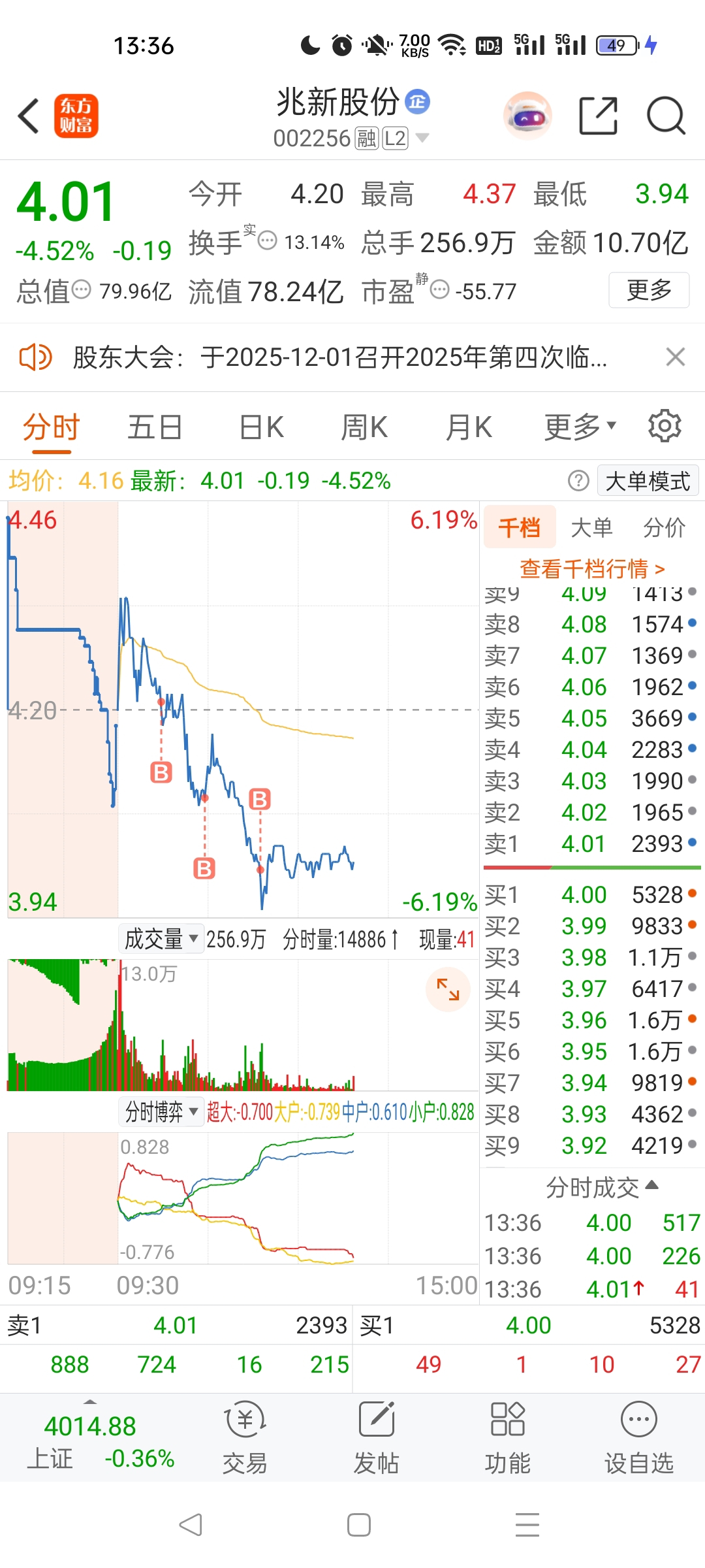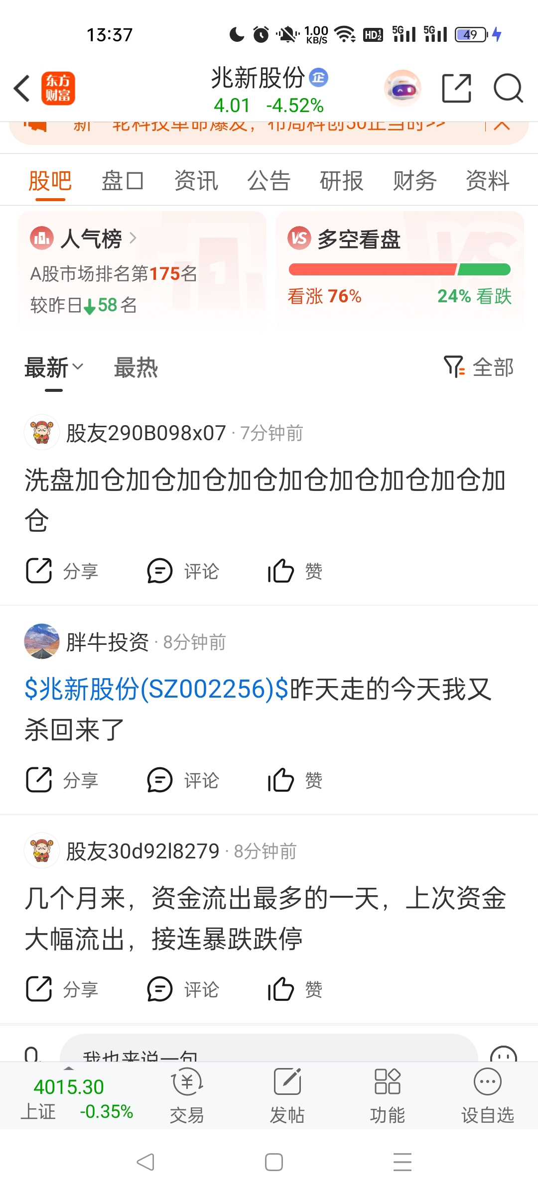 $兆新股份(SZ002256)$ 看到这些一群股吧唱多的,截图买入的,现在果断不看好了,3.97为啥拉上去就是破位了慢慢出了,投票也看多,股吧也唱多晒图,下午收盘前破了4块钱果断走,祝你们幸福。还好我有利润,买了就偷偷拿着,还出来唱,想都进来了主力给你抬轿子