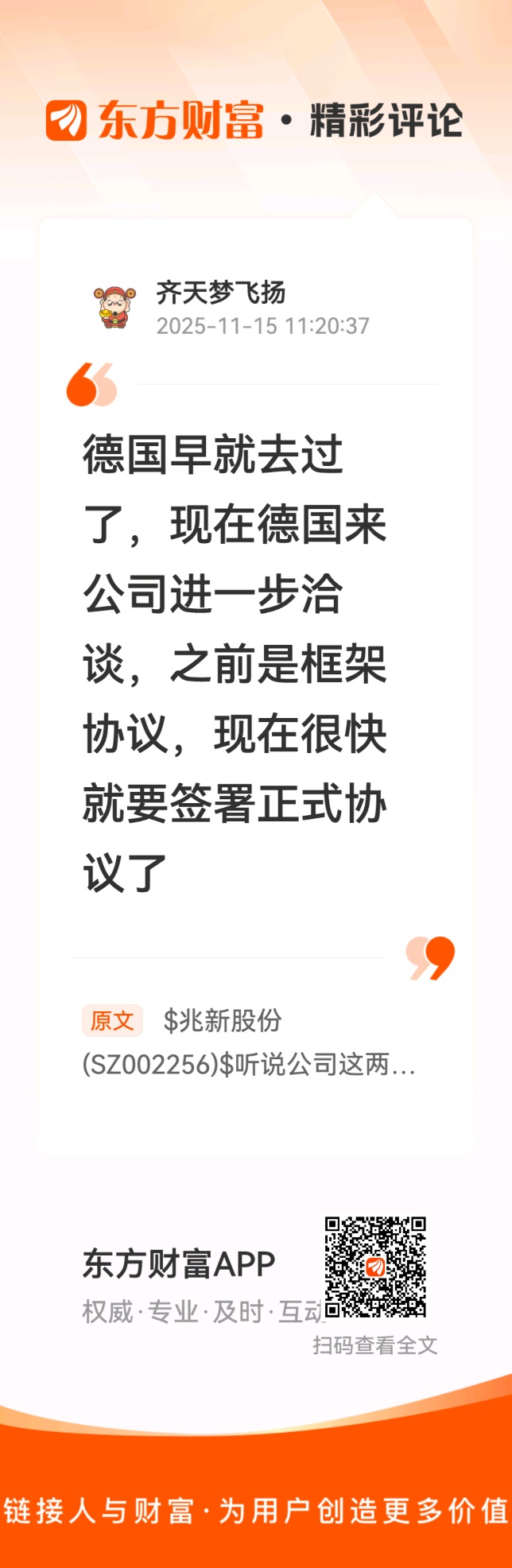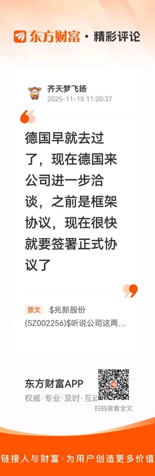 //@齐天梦飞扬 :德国早就去过了,现在德国来公司进一步洽谈,之前是框架协议,现在很快就要签署正式协议了