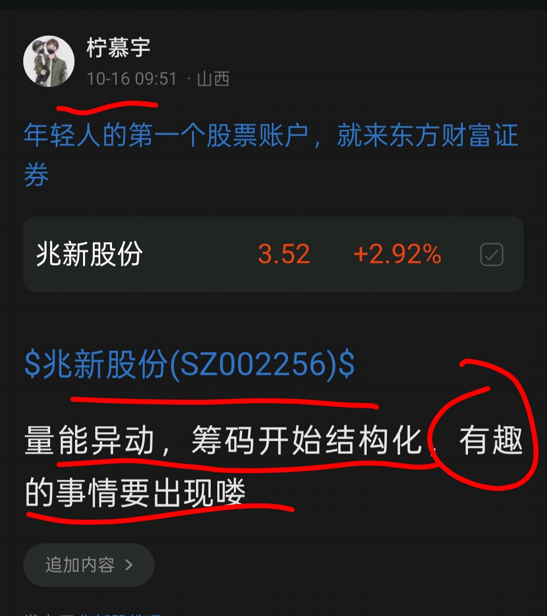 郑重声明:用户在财富号/股吧/博客等社区发表的所有信息(包括但不限于文字、视频、音频、数据及图表)仅代表个人观点,与本网站立场无关,不对您构成任何投资建议,据此操作风险自担。请勿相信代客理财、免费荐股和炒股培训等宣传内容,远离非法证券活动。请勿添加发言用户的手机号码、公众号、微博、微信及QQ等信息,谨防上当受骗!