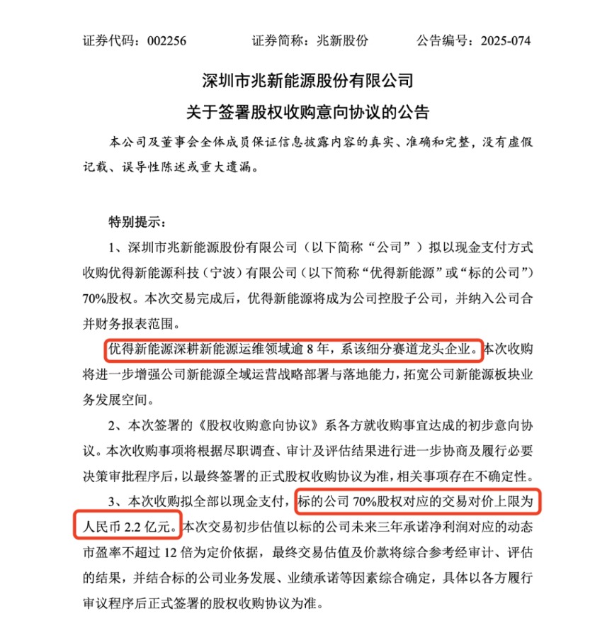 12月11日晚间,兆新股份发布公告称,拟以现金支付方式收购优得新能源70%股权,对应的交易对价上限为2.2亿元。交易完成后,优得新能源将成为公司控股子公司。