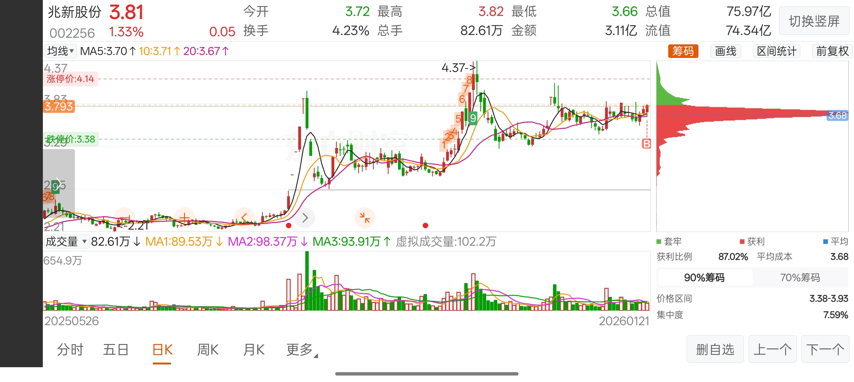 $兆新股份(SZ002256)$ 筹码峰集中,拉升指日可待,今天入手2千股,坐等一条999