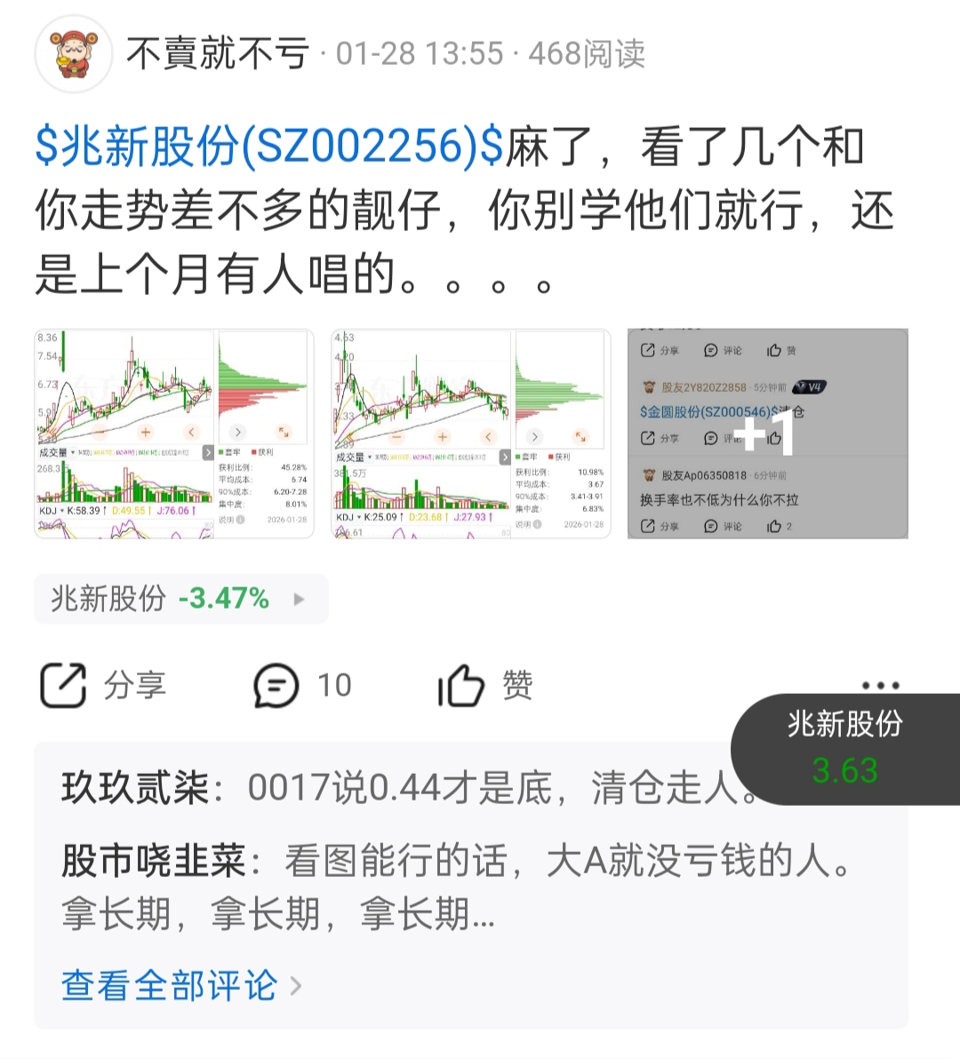 $兆新股份(SZ002256)$ 一点都不学好,你还真学中锐股份和金圆股份的走势了,走势差不多的这种票低位潜伏的散户是真的多