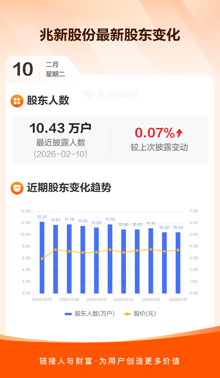 兆新股份最新披露数据显示,截至2月10日公司股东户数为10.43万户,较上期(2026年1月30日)增加78户,增幅为0.07%。户均持有流通股数量为1.87万股,与上期基本持平,户均持股金额由上期的6.72万元增加至6.92万元。