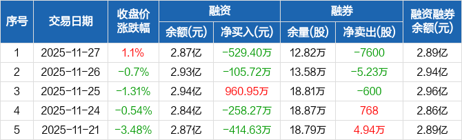 利尔化学:融资净偿还529.4万元,融资余额2.87亿元(11-27)
