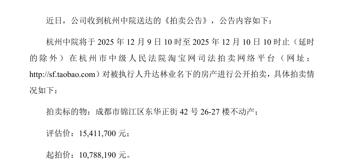 11月11日盘后,升达林业(002259)公告称,浙江省杭州市中级人民法院(以下简称“杭州中院”)将于2025年12月9日10时至12月10日10时止(延时的除外)在淘宝网司法拍卖网络平台对公司名下的房产进行公开拍卖。