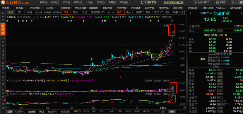金瑞矿业:周末受股价异常波动影响,早盘低开以后,一直在黄线下方进行窄幅震荡,最后还是跌停,今天在科技领域,半导体和机器人芯片等领域调整还是非常明显,这对于处于上游原材料领域的金瑞矿业来说,自然也受了影响,而且最近在市场之中,科技领域热点主要还是集中在中游的生产研发还有下端的销售上,对于上游端的原材料来说,因为主要是属于资源类,还有就是比较冷门的化学一类,所以题材爆发上,有点受限,还有就是技术上上周涨停以后,K线距离5日均线已经产生可距离,但是行情向上,少不了均线支撑,所以此次回落以后,还是等踩到均线企稳,二次爆发,继续拉涨的时候,具体问题具体分析。