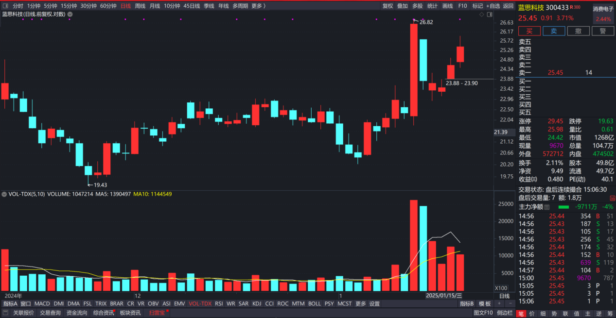 蓝思科技:盘中持续拉升,尾盘才有所回落,日线形态来看,该股是突破新高后的回调,今天是再度启动,有可能进入加速的状态。基本面来看,公司是消费电子板块,年报有预增的预期,而且今天消费电子也走的很强,公司主要产品有智能手机电15日脑类、新能源汽车及智能座舱类、智能头显与智能穿戴类、其他智能终端类。现在消费电子板块多数个股都在涨。