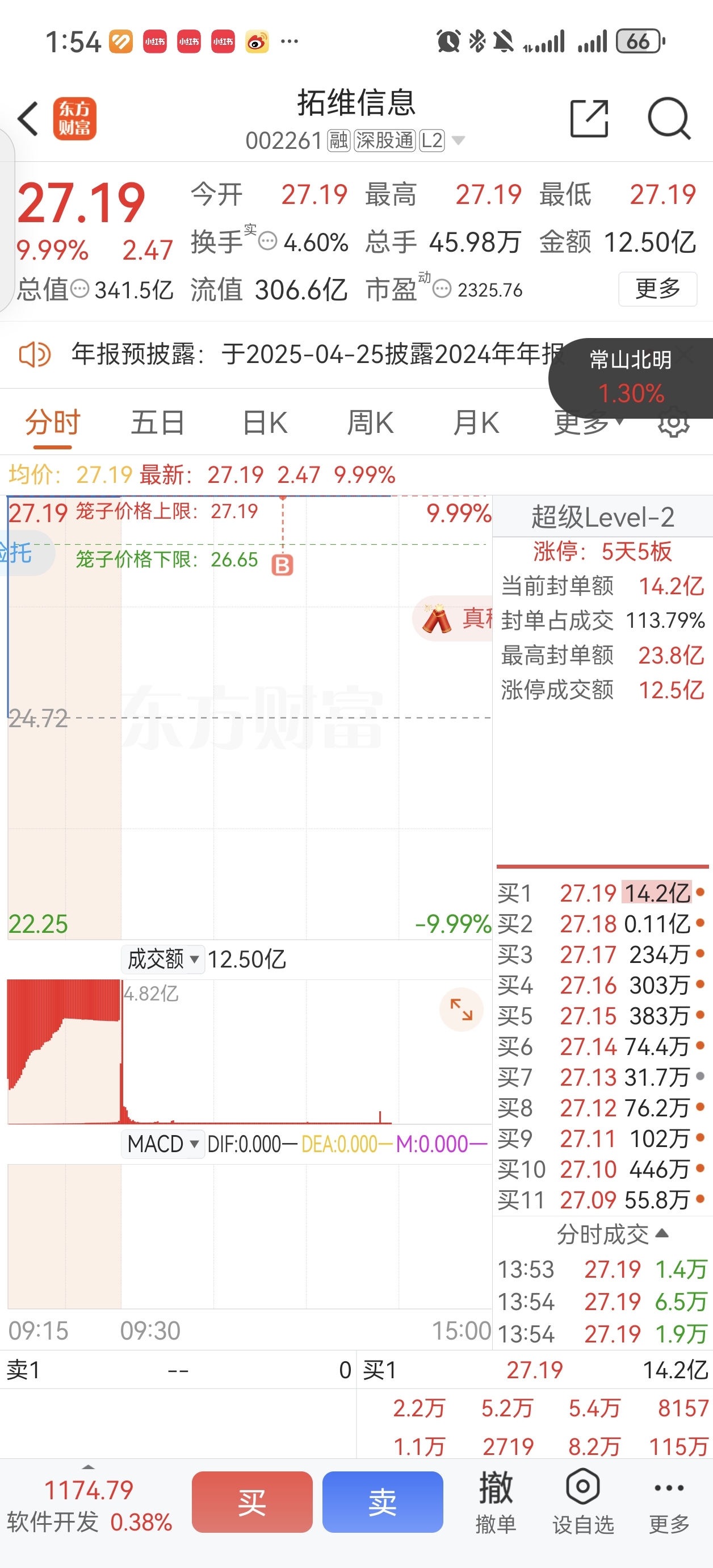 $拓维信息(SZ002261)$ 早上集合竞价25分买了一手 中午前买进了 这不是好事