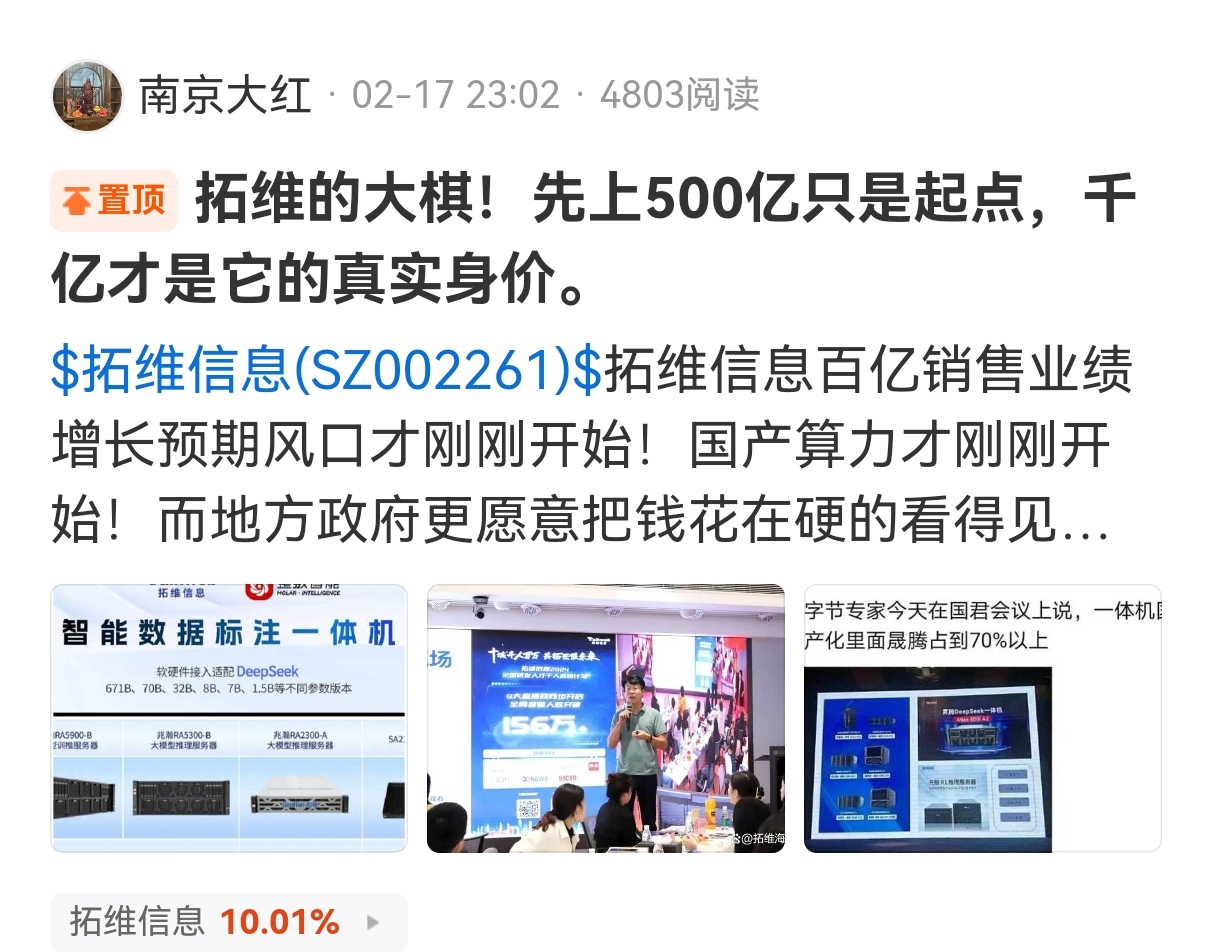 上一期 大红老师作为全股吧甚至可以说是全网唯一一个在两周前给拓维信息定价第一阶段目标价格500亿市值的人。