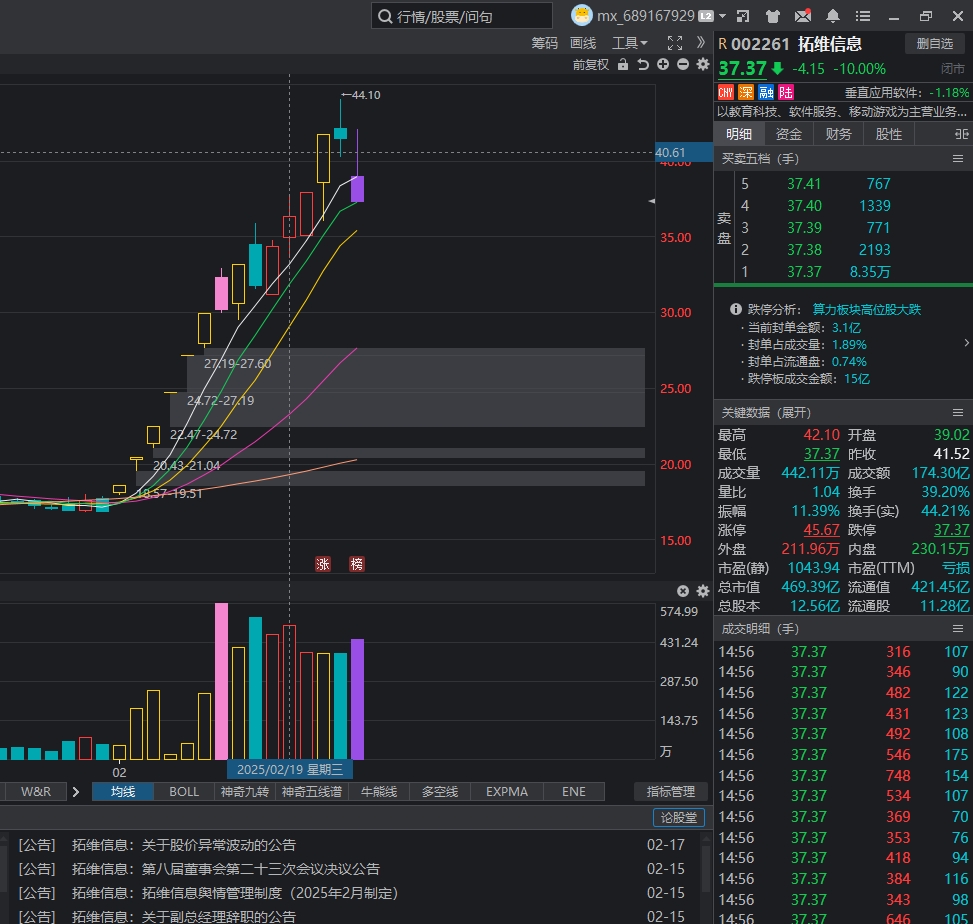 $拓维信息(SZ002261)$ 这个票是成交量堆起来的,不会直接A杀,参考大众、华强,另外一种就是直接连板上来,参考青岛金王,川发龙蟒这些,成交量高的票一般都会高位震荡,高点会有反复,因为成交量太大,主力没法出货,需要反复上下拉升震荡,拓维连续好几天成交量前五,后面怎么走不用我多说了吧
