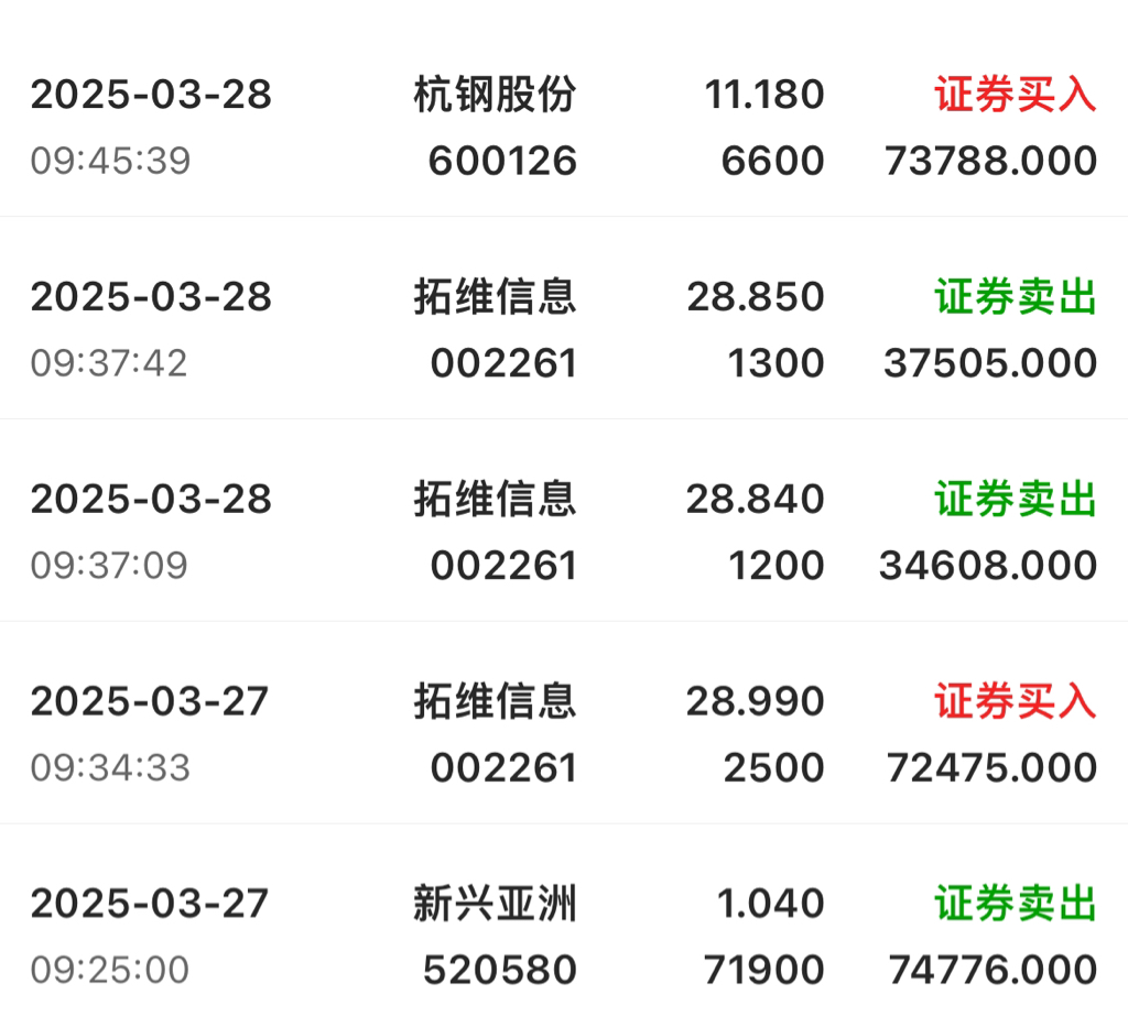 $拓维信息(SZ002261)$ 周五卖了拓维,打板杭钢,今天回本赚1个点出了杭钢,打板怕了,不敢接回来,模拟盘进了,认知到了,心理素质玩不过主力,下午尾盘又进了拓维,希望明天能站上五日线,散户想赚钱只能着,大A散户的悲哀
