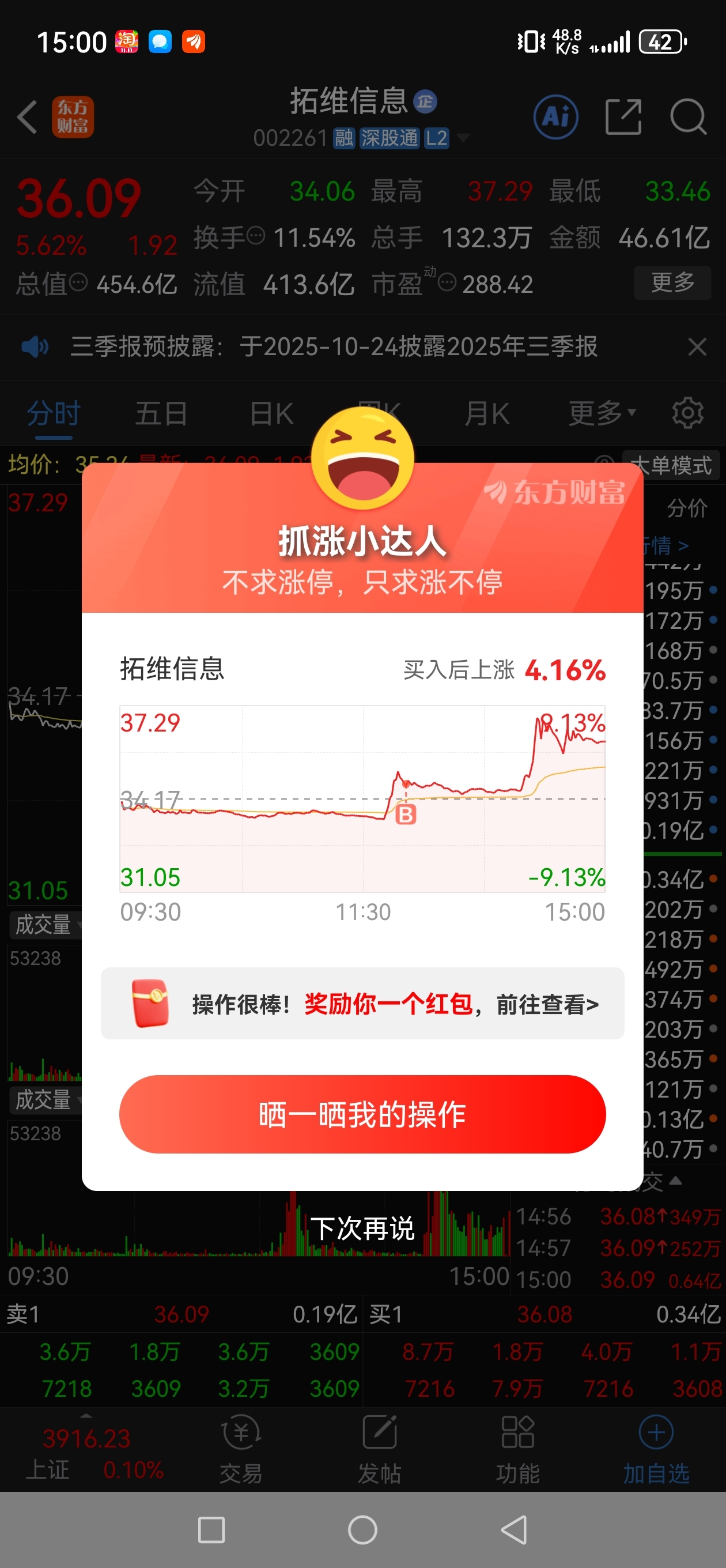 $拓维信息(SZ002261)$ 踏空的难受吧?一个个在这叫唤,明天吃大肉