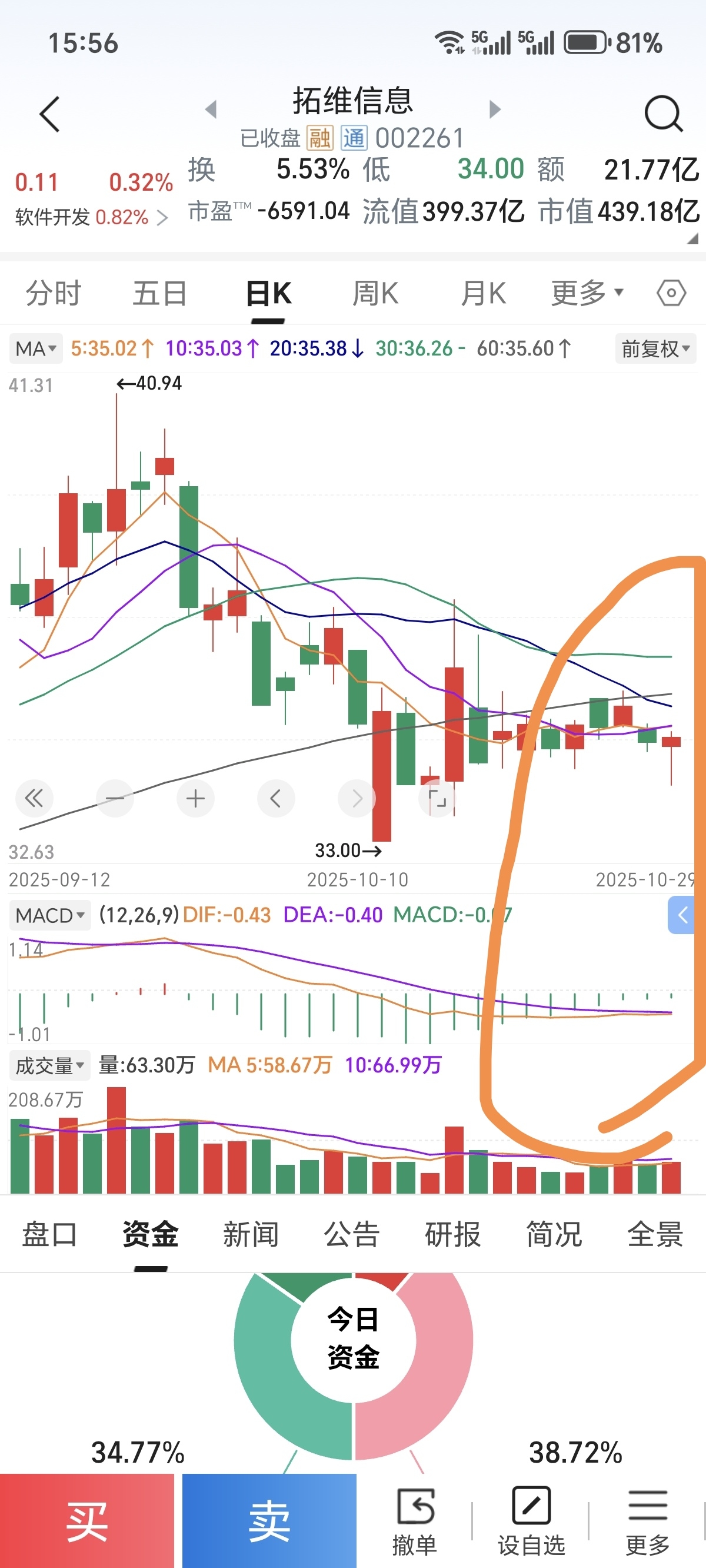 日K线金针探底,MACD马上金叉,绿柱进一步缩短,底部特征出现,明天开始大概率趋势向上,但拓维主力往往不走技术路线,经常三拳,干,死老师傅
