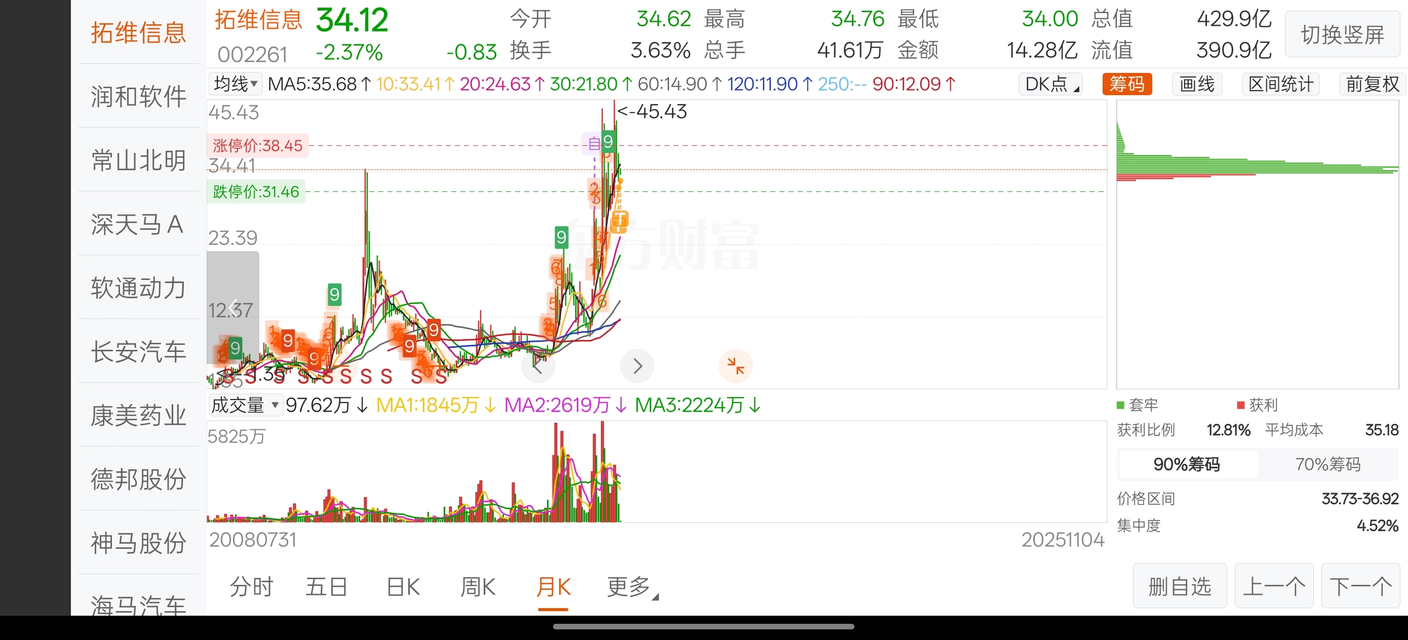 $拓维信息(SZ002261)$ 平均成本35.12,获利筹码,12%。都是亏本卖啊你们,真牛