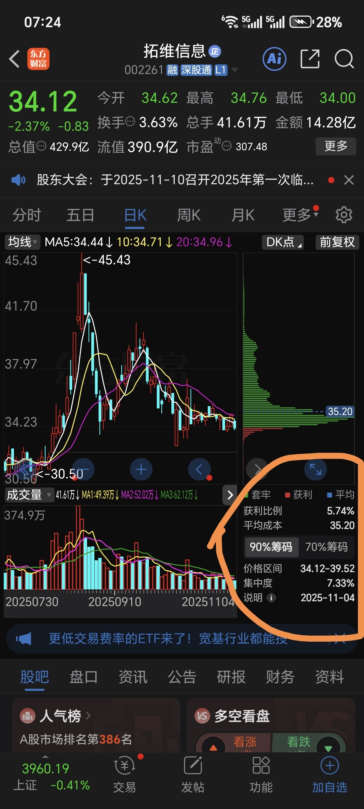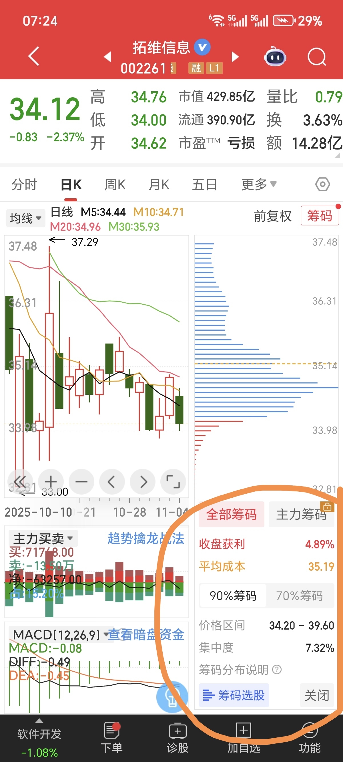 看看这获盘比例筹码峰,难道都准备赔本儿大甩卖?还有主力的成本,估计也得35左右吧。难道大家都准备掀了桌子不过了