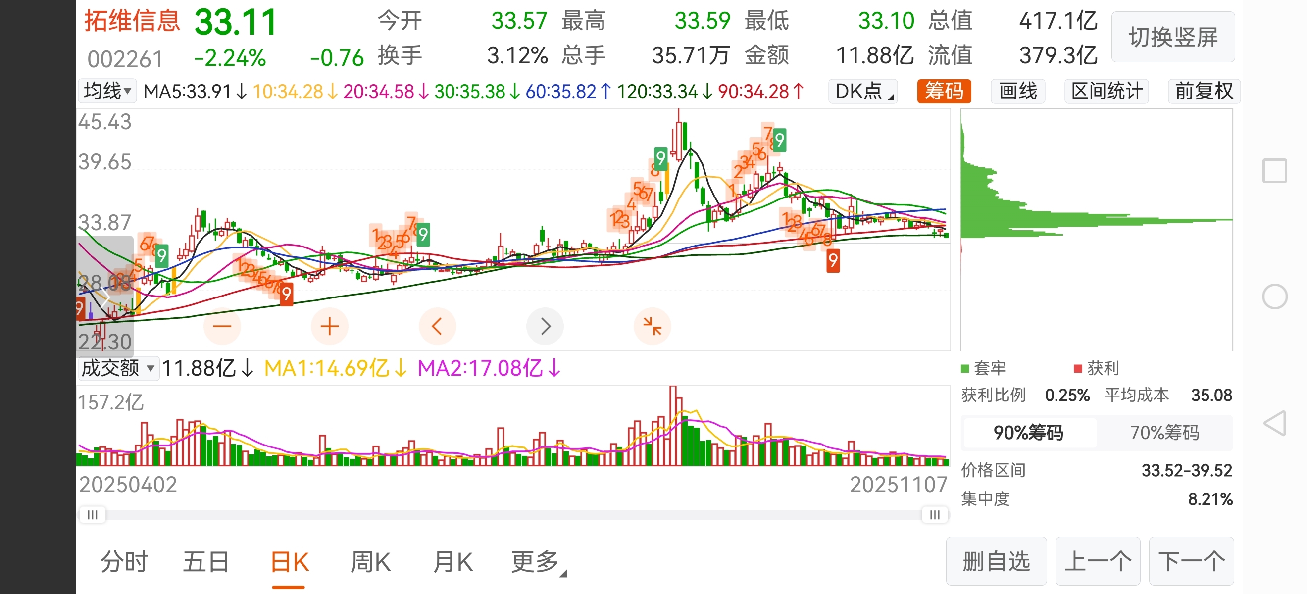$拓维信息(SZ002261)$ 大家也别太急,第一阶段洗完获利盘(已经完成),第二阶段洗完套牢盘(把36元以上的筹码震出来),预计11月中下旬启动行情,如果被深度套牢的朋友也别急着补仓,如果中旬能放量,日交易额在30亿以上,可以逐步补仓做T,如果不放量还是20亿以下的交易额,那就拿着。