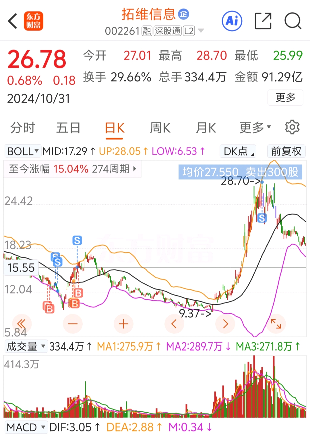 $拓维信息(SZ002261)$ 上次前前后后操作了1100股,进来被套割肉,剩100股。次日不甘心又买了200股,300股凭借超强的等待,回本还赚了点。