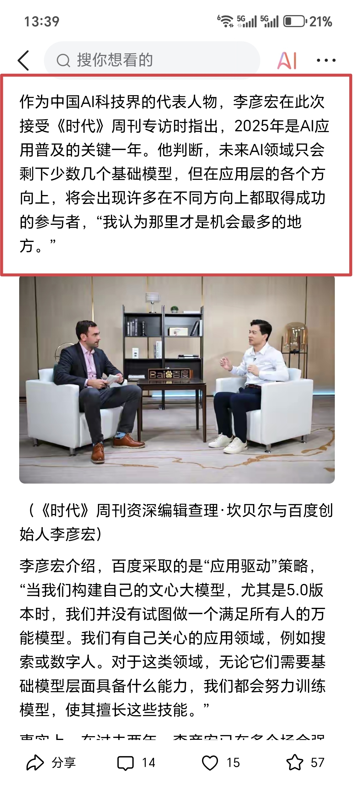 12月12日,李彦宏关于Ai未来发展方向观点。