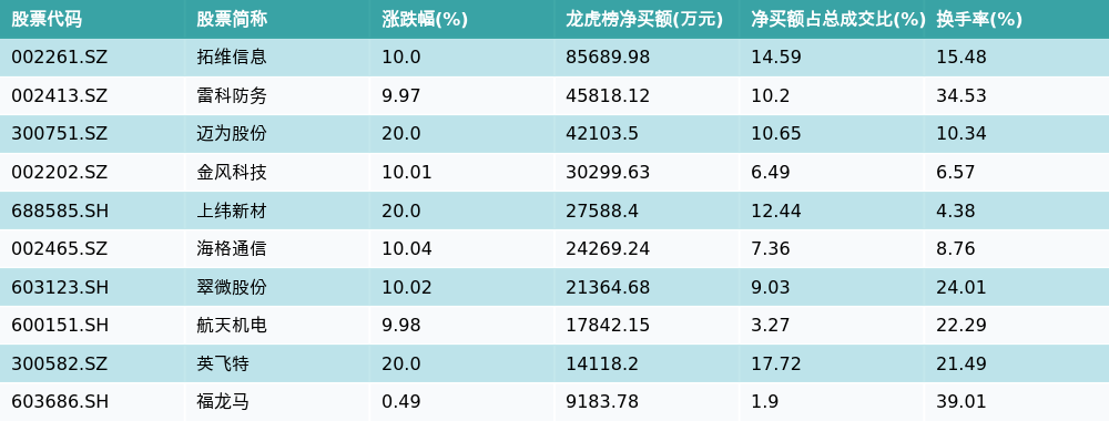 南财智讯12月29日电,南财金融终端数据显示,因当日异动登上龙虎榜的个股中,资金净买入最多的前三位分别是拓维信息(002261.SZ)、雷科防务(002413.SZ)与迈为股份(300751.SZ)。其中排名第一的拓维信息净买额达8.57亿元,占总成交金额的14.59%。拓维信息当日收盘上涨10.0%,换手率为15.48%,净买入额前10个股详情见下图: