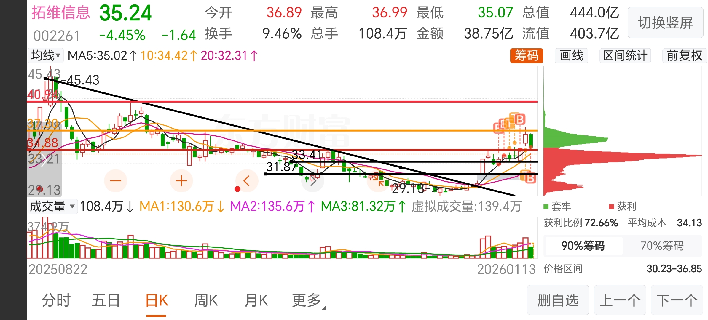 今天一开盘,拓维跟着大盘往下走,35.21的价格贴着5天线晃悠,我的心也跟着揪了起来。盯着筹码分布图,35元附近正是筹码密集区的顶峰,一边是技术面的支撑位,一边是大盘调整带来的情绪恐慌,脑子里两个声音在打架。