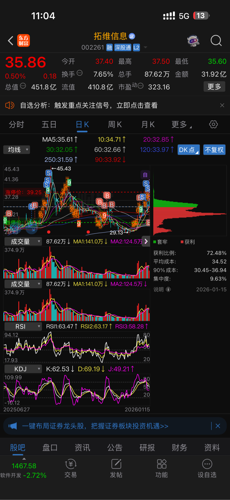 $拓维信息(SZ002261)$ 拓维感觉蛮好的,之前一波赚了30%多,这一次赚了19%(低点的时候没子弹了)感觉低点加仓也能挣30%多,买票放弃幻想拿到实打实的才是真的。