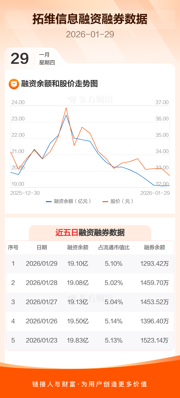 交易所最新数据显示,拓维信息于2026年1月29日获融资买入1.25亿元,融资偿还1.22亿元,当日融资净买入232.56万元。目前,该股融资余额19.10亿,占流通市值比例为5.10%。