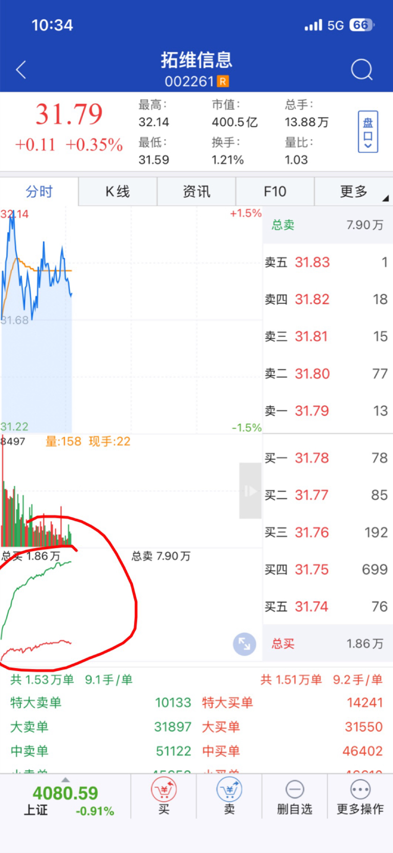 $拓维信息(SZ002261)$ 根本原因还是散户太多卖盘太多啦。能涨就奇怪了。要不是业绩还可以。早就绿了。你看这个绿色那么高,红色和绿线口子张那么大,绿线不往下拐弯或者红线不往上拐,都不会涨