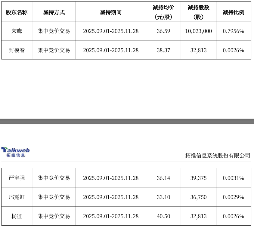 2025年11月29日,拓维信息公告,股东宋鹰于2025年9月1日至11月28日通过集中竞价方式减持1002.3万股,占总股本0.7956%,减持均价36.59元/股。同期,公司董事、高管封模春减持3.28万股,高管严宝强减持3.94万股,邢霓虹减持3.68万股,杨征减持3.28万股。减持后宋鹰持股比例由7.2003%降至6.4043%。