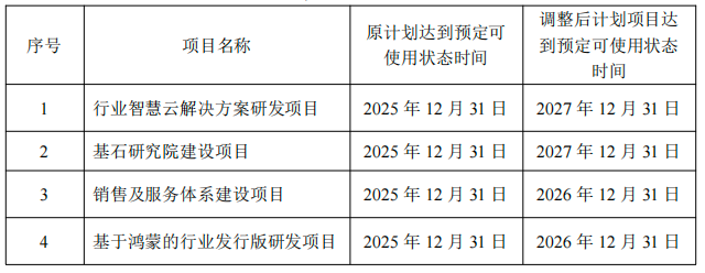 拓维信息表示,受社会经济、宏观环境等客观因素的影响,公司行业智慧云解决方案研发项目、基石研究院建设项目、销售及服务体系建设项目和基于鸿蒙的行业发行版研发项目在设备采购、人员投入等各方面受到了一定程度上的制约,预计无法在原计划的时间内达到预定可使用状态。