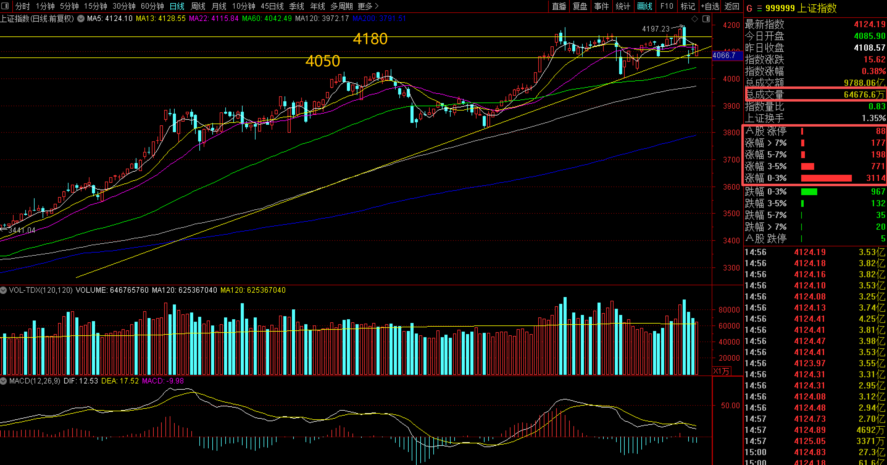 技术形态来看,三大指数延续反弹走势,上证指数成功站稳4100点关键关口,短期支撑位上移至4080点,上方4150点构成阶段性压力位;创业板指走势相对平缓,需突破3250点压力位,才能进一步打开上行空间。整体来看,指数短期震荡修复趋势明确,但量能不足制约反弹高度,后续需关注成交量能否持续放量。