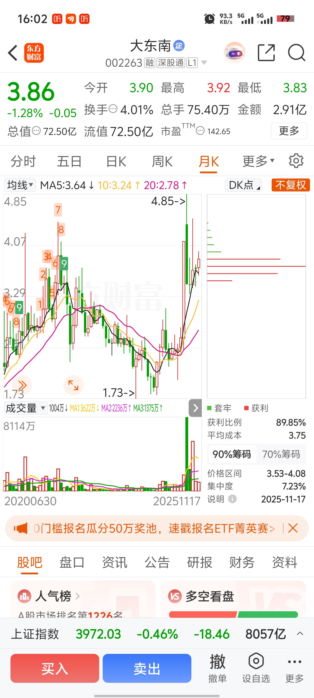 $大东南(SZ002263)$ 完蛋了,月线拐头向下,早上不应该补的,还好尾盘清仓原来的