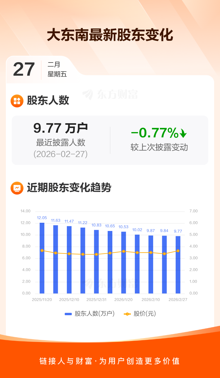 大东南:截至2月27日最新股东户数9.77万户,较上期减少0.77%