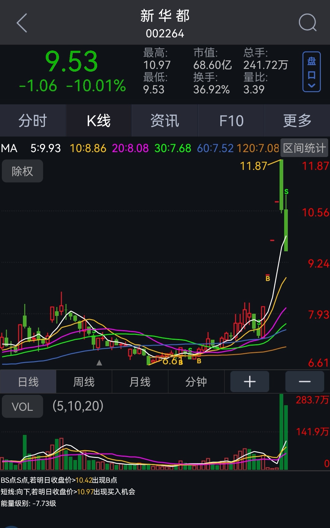 两天天量巨阴,破5天线,下周股价铁定要向10天线靠拢,这是毫无疑问不容置疑的!管住手,谨慎参与,切记盲目搏反弹或补仓摊低成本!