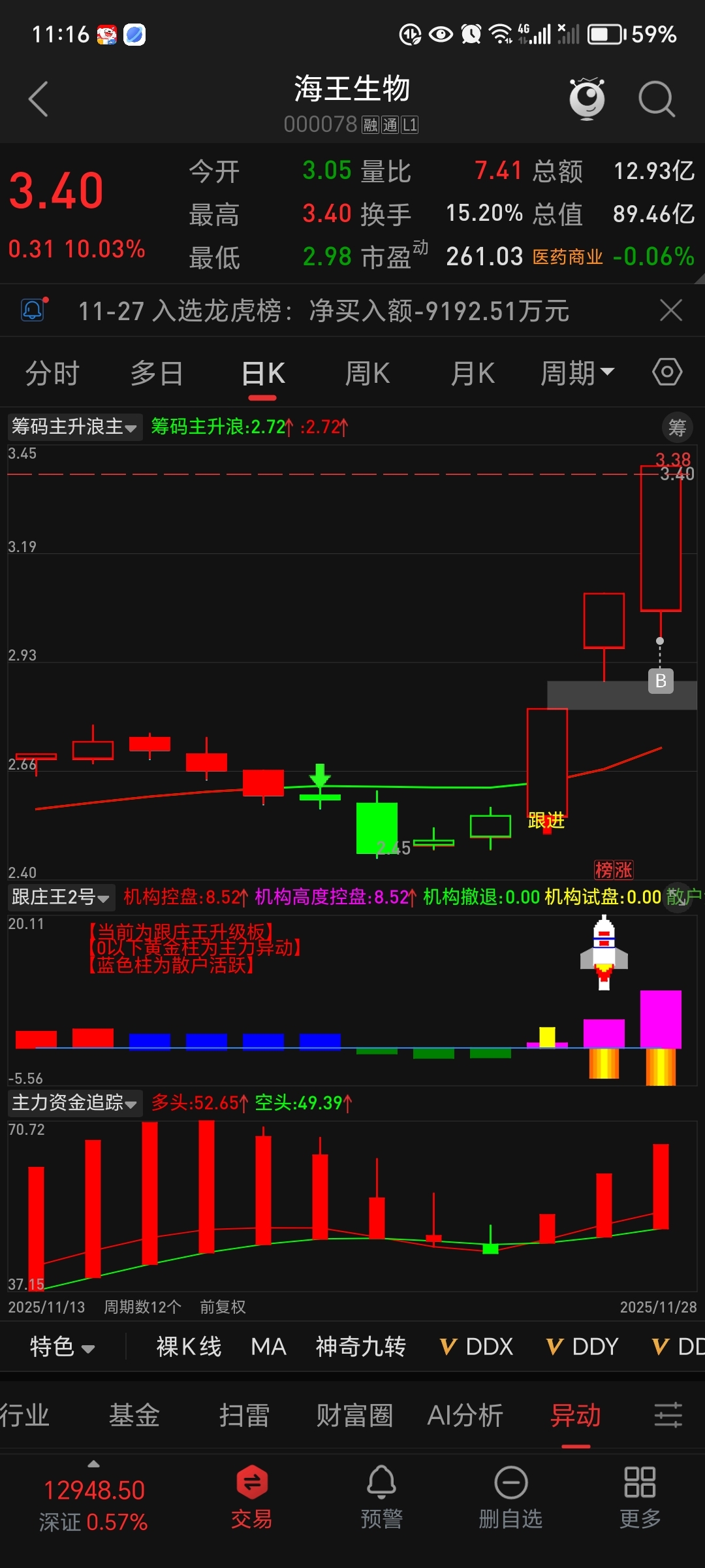 2. 个股弱转强识别:在此背景下,“海王生物”今日开盘后迅速走强,成功实现了对前一日弱势状态的扭转。这种“弱转强”往往是资金态度发生转变、做多意愿增强的积极信号,尤其是在板块轮动中,可能预示着该股有望在当日的轮动中脱颖而出。
