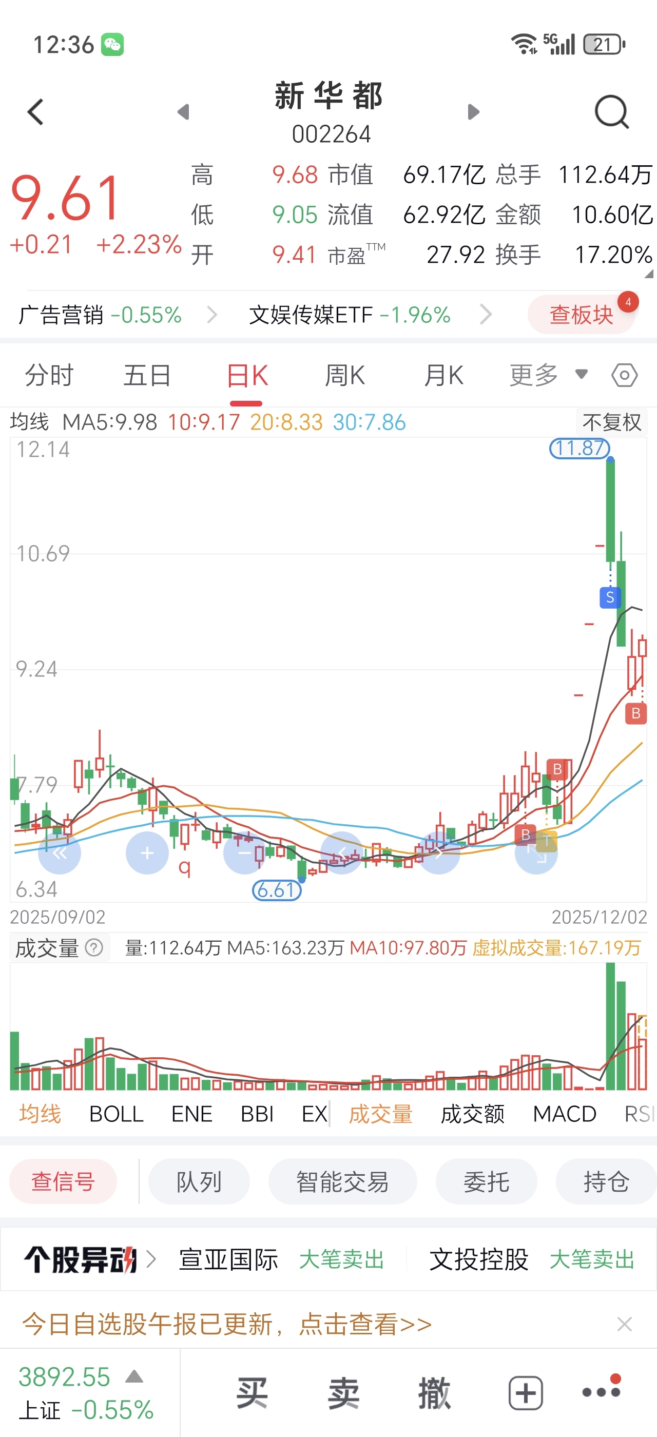 $新 华 都(SZ002264)$ 今天站上10块才有希望