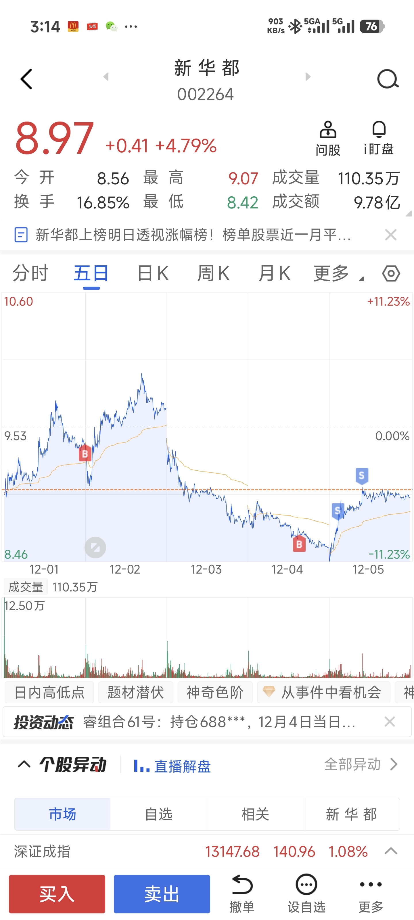 今天清的差不多了,在成本线左右只留了底仓,理由其实也还是量能不足+五日线压制+反弹无力,再加上一般来说板块这种暴力拉升以后很容易又迎来分歧,新华都风险还是比较大的,我选择观察下周一走势,如果承接力度较强的话还是可以买的,这个位置20日线支撑,总体也不算很高