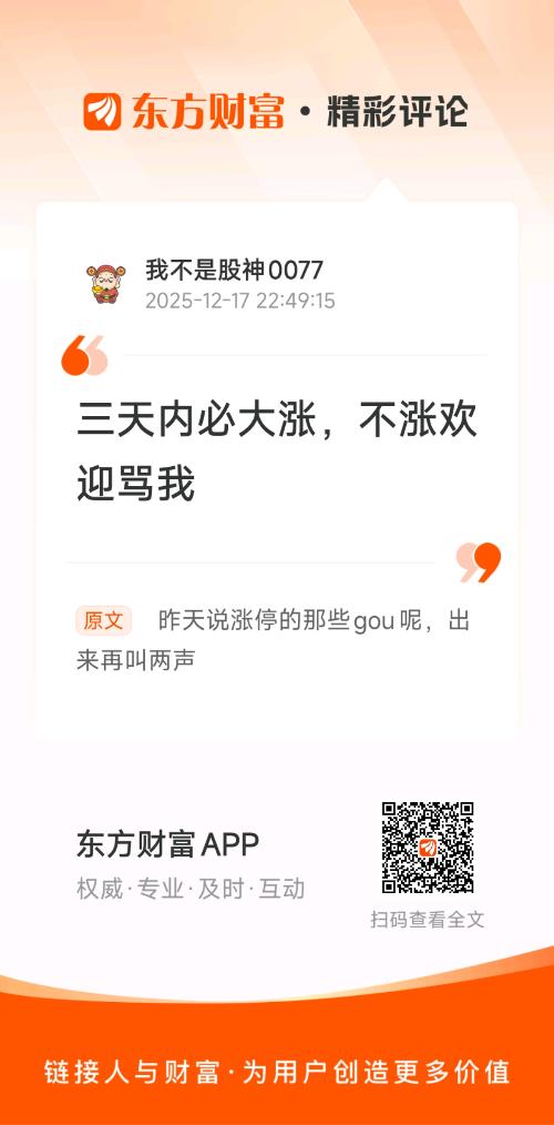 温馨提示: 1.根据《证券法》规定,禁止编造、传播虚假信息或者误导性信息,扰乱证券市场;2.用户在本社区发表的所有资料、言论等仅代表个人观点,与本网站立场无关,不对您构成任何投资建议。用户应基于自己的独立判断,自行决定证券投资并承担相应风险。《东方财富社区管理规定》
